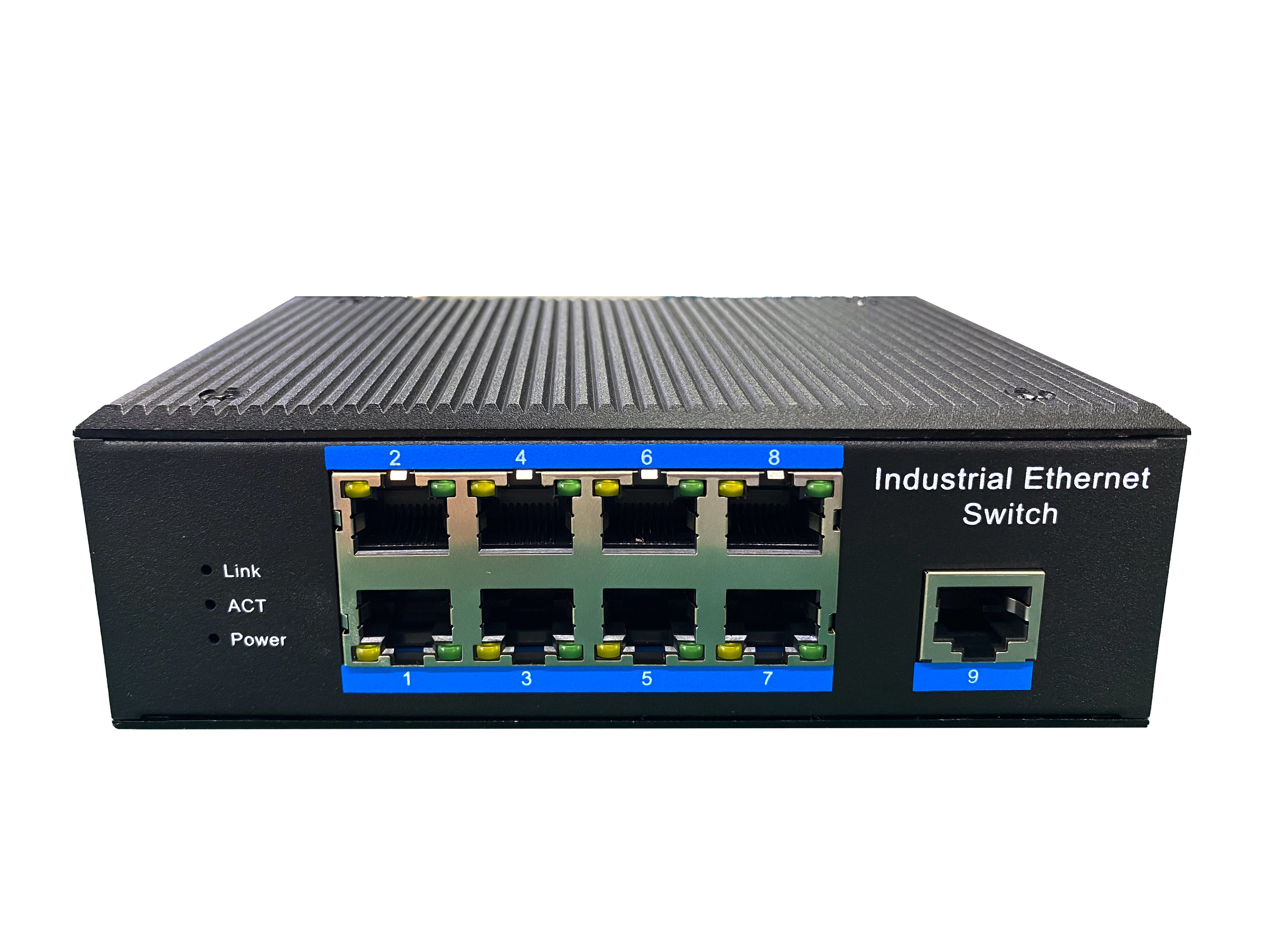 工業級(NT品牌)百兆非網管9電,導軌式-DC12~52V供電-寬溫(-40℃-85℃)。默認不含AC電源適配器。