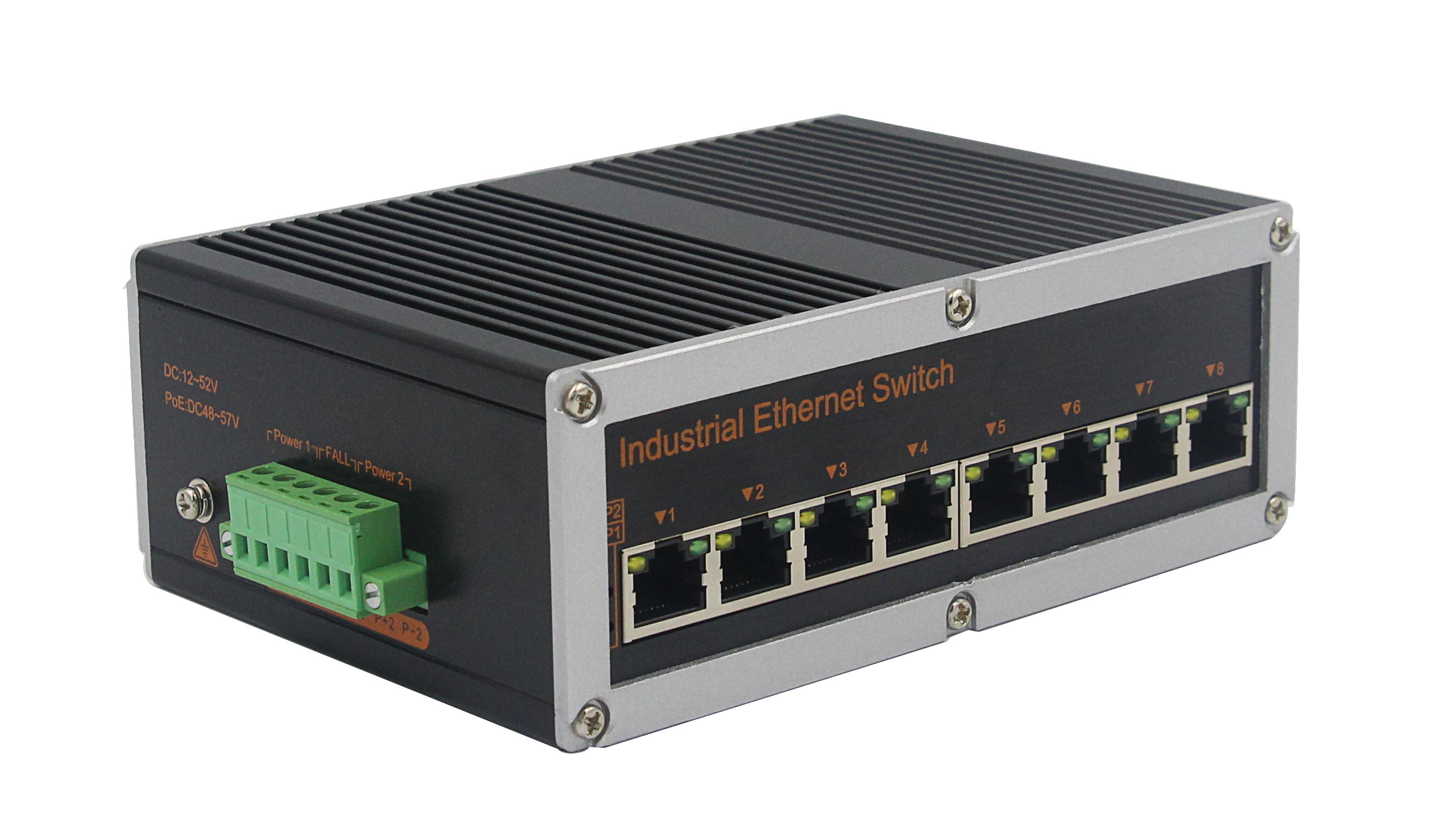 百兆8電工業級以太網交換機產品符合 FCC、CE、ROHS 標準。此系列交換機具有 -40℃~ 85℃的工作溫度, 具有超強的堅固度能適應各種嚴苛環境,也可以非常方便的安置在空間緊湊的控制箱中。導軌式的安裝特性、寬溫操作及擁有 IP40 防護等級的外殼及 LED 指示燈,使之成為一個即插即用的工業級設備,為用戶的以太網設備聯網提供可靠、便捷的解決方案。