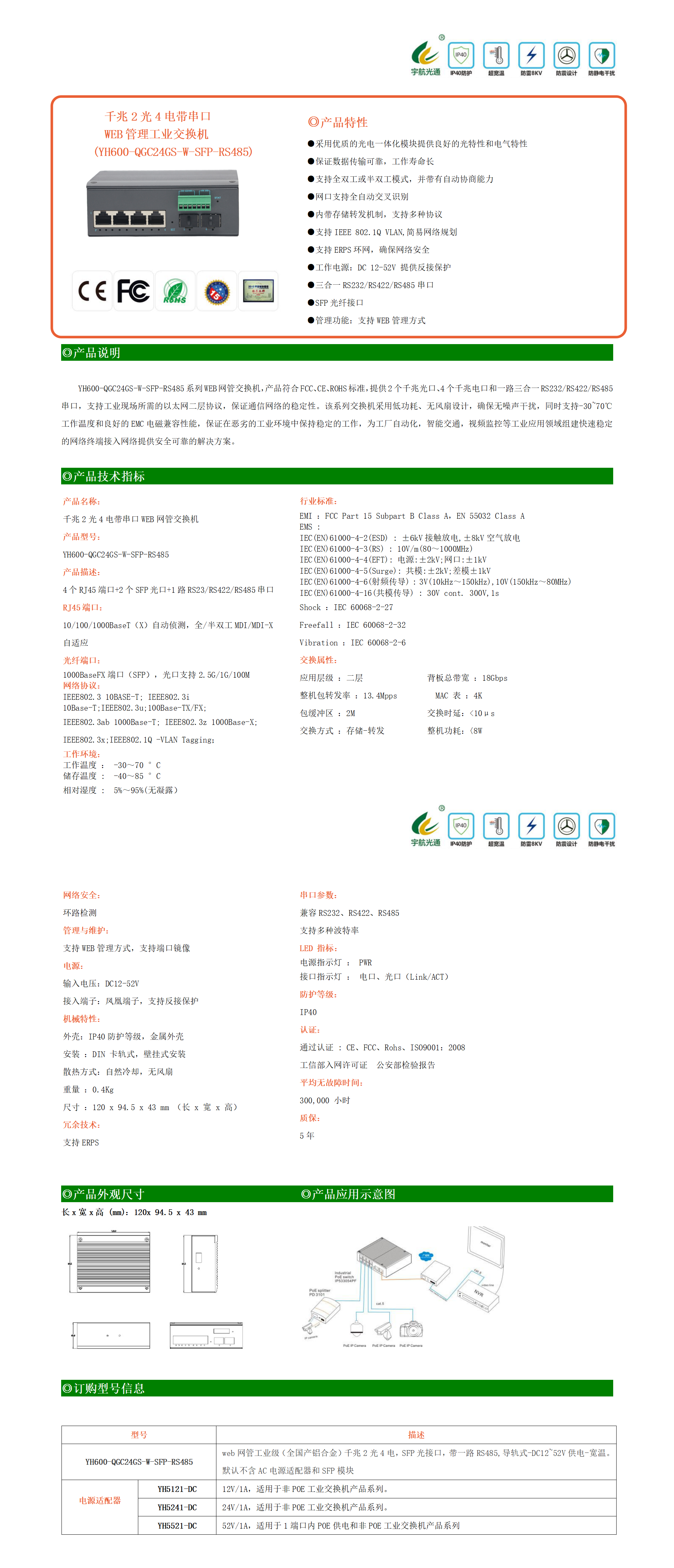 YH600-QGC24GS-W-SFP-RS485系列WEB網管交換機,產品符合FCC、CE、ROHS標準,提供2個千兆光口、4個千兆電口和一路三合一RS232/RS422/RS485串口,支持工業現場所需的以太網二層協議,保證通信網絡的穩定性。該系列交換機采用低功耗、無風扇設計,確保無噪聲干擾,同時支持-30~70℃工作溫度和良好的EMC電磁兼容性能,保證在惡劣的工業環境中保持穩定的工作,為工廠自動化,智能交通,視頻監控等工業應用領域組建快速穩定的網絡終端接入網絡提供安全可靠的解決方案。